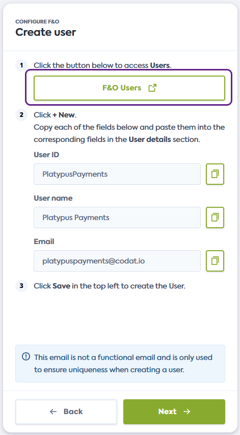 On the Create user screen of the connection flow, click the link provided. It will open the Users page of Dynamics F&O in a new window.