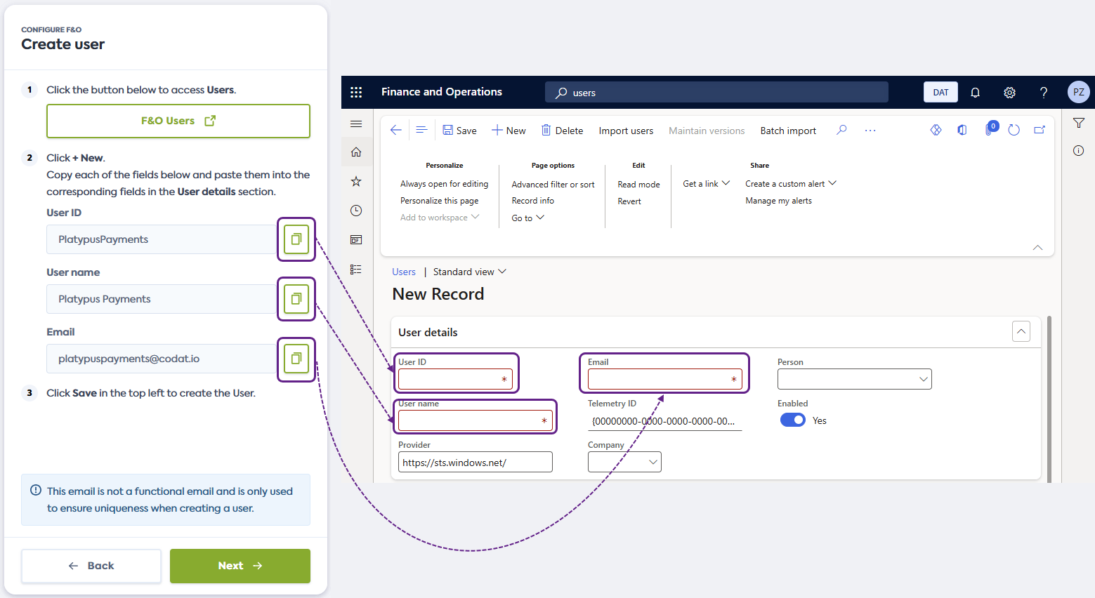 Copy the proposed User ID, User name, and Email from the connection flow and paste them into the corresponding fields in Dynamics 365 F&O.